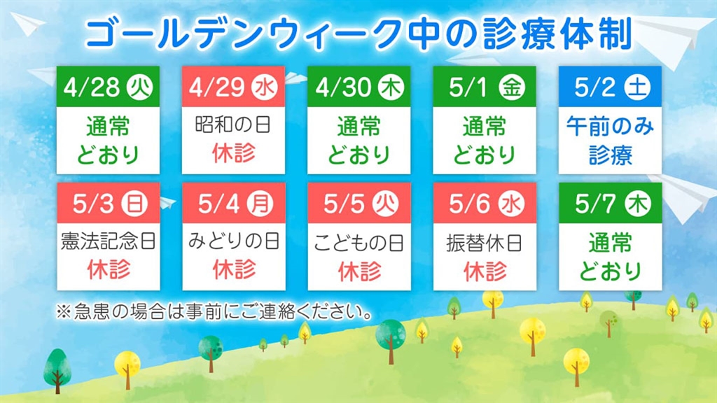 4/23更新:ゴールデンウイーク中の診療について